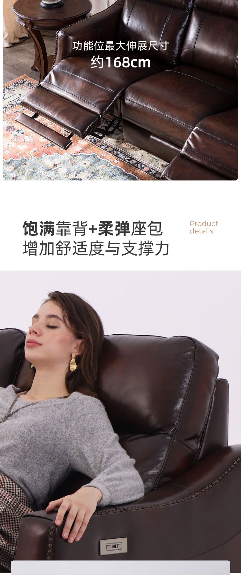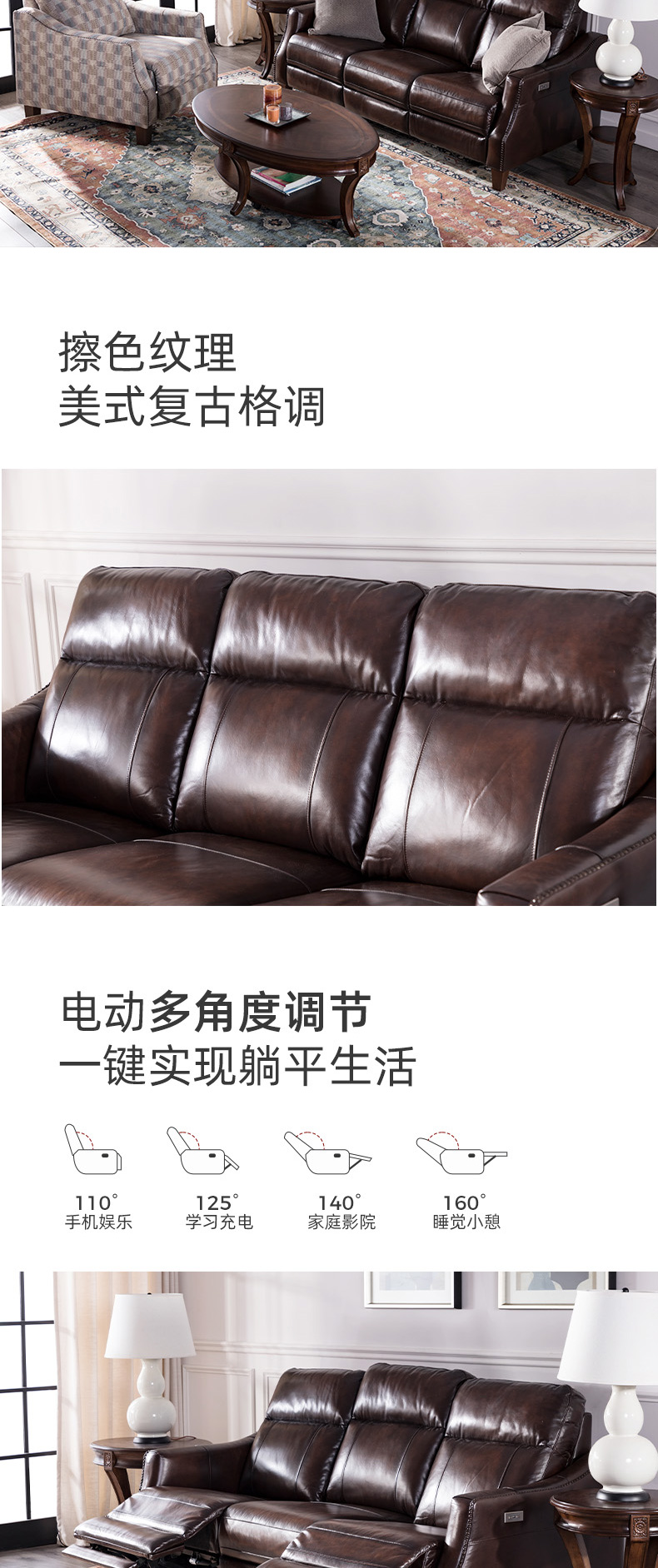 | 设计理念: | 美式经典电动功能沙发,沉稳大气深棕色,原汁原味美式风情,在功能沙发造型上,恺丽之家产品设计师,运用现代创新艺术设计手法,摒弃传统功能沙发的臃肿,线条更加精致简约,更加节省现代居住空间,人体工学分段式创新设计,实现全身心的伸展与放松,同时置入智能科技家居功能,一键触发,实现更多可能性。全新打造集美观设计与实用为一体现代功能沙发, 符合都市人不将就,不赘余的生活追求,打拼不再孤军奋战,放松休闲有伴。 |