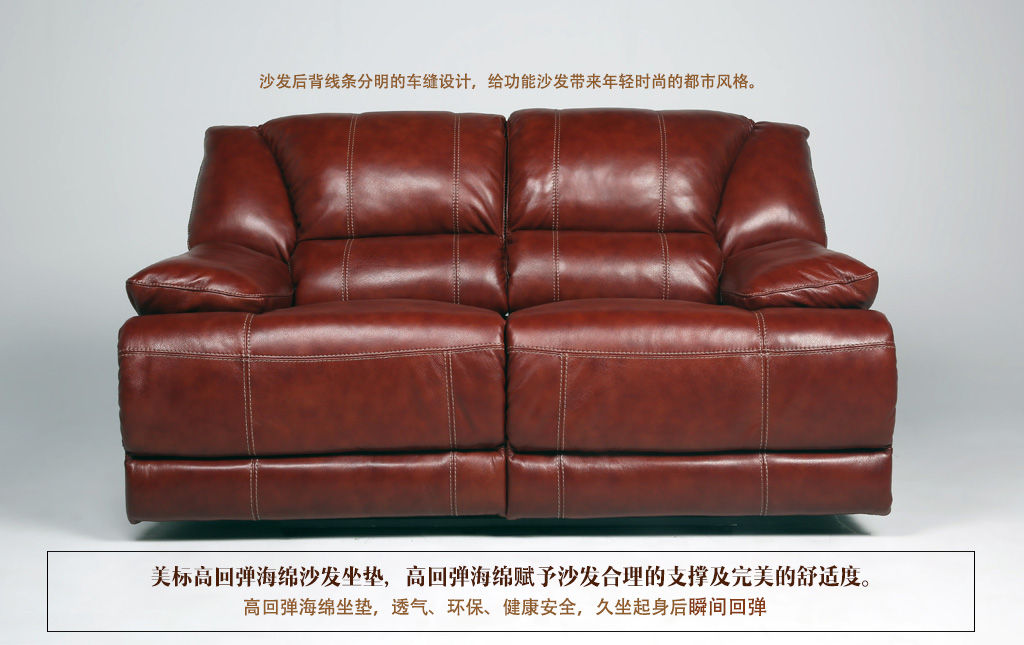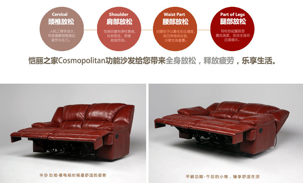 经典奢华,高贵红棕色,进口头层牛皮,触感柔软舒适, 靠背经典分割设计,线条简洁,给功能沙发带来年轻、时尚的都市风格。 功能沙发可坐、半卧亦可平躺,恺丽之家致力于将沙发舒适最大化,给您和您的家人带来最舒适的放松方式,会友聊天、看书、看电视、