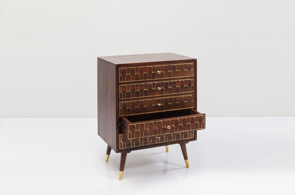 恺丽之家Muskat 五斗柜, 来自于德国高端家居品牌KARE-DESIGN,斗柜现代简约轮廓,描金饰面设计,轻奢格调,耀眼而华丽;抽屉把手以及柜脚黄铜色点缀着自然木面纹理,张弛有度,尊贵又不失自然气息;精致考究的做工,为空间装饰献上独特的艺术气质,令人一见倾心。