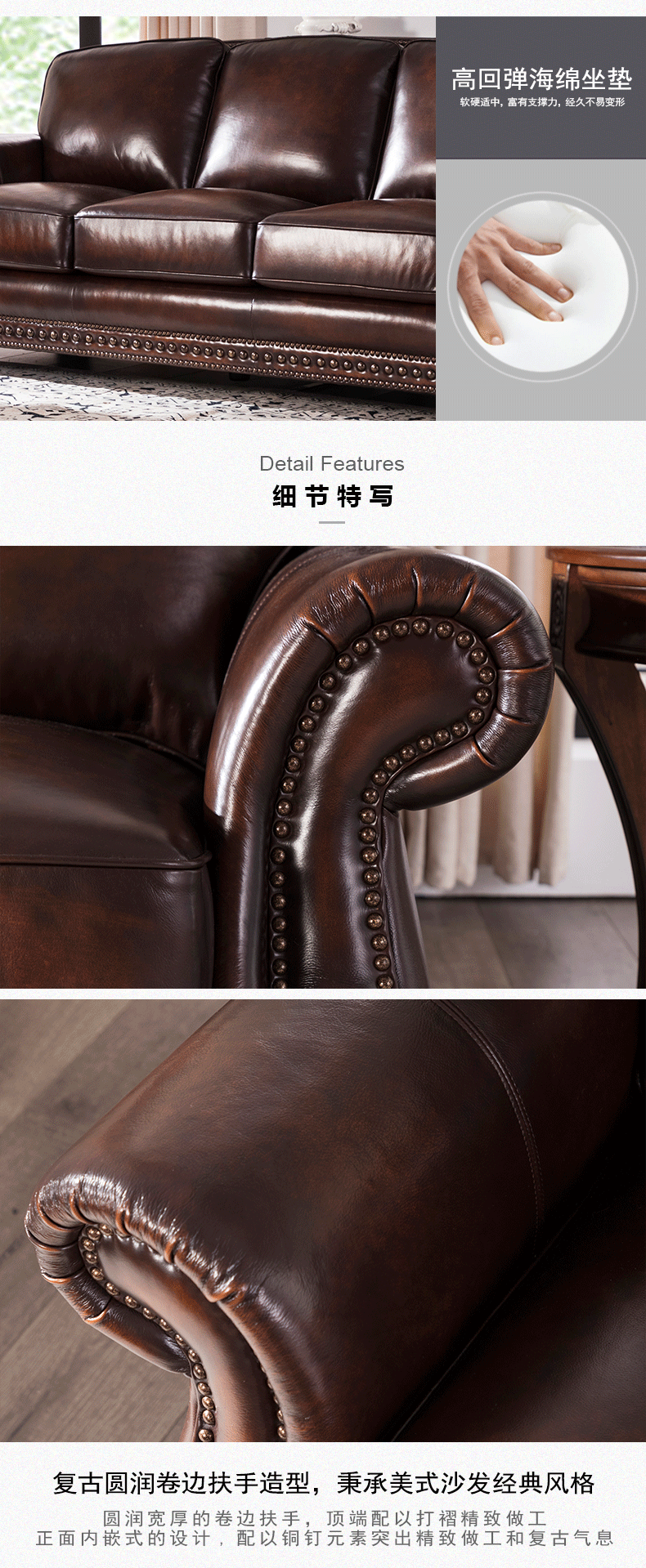 美式经典风格,打造居室复古情怀。手动式功能沙发,一拉即刻尊享舒适舒展生活。甄选上等头层牛皮材质,用料讲究。纯手工擦色皮面处理工艺,让做旧设计处理更加自然,质感出众,演绎居室端庄与大气格调。