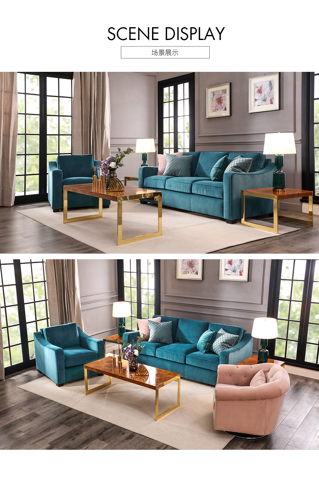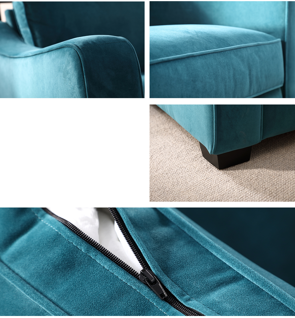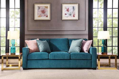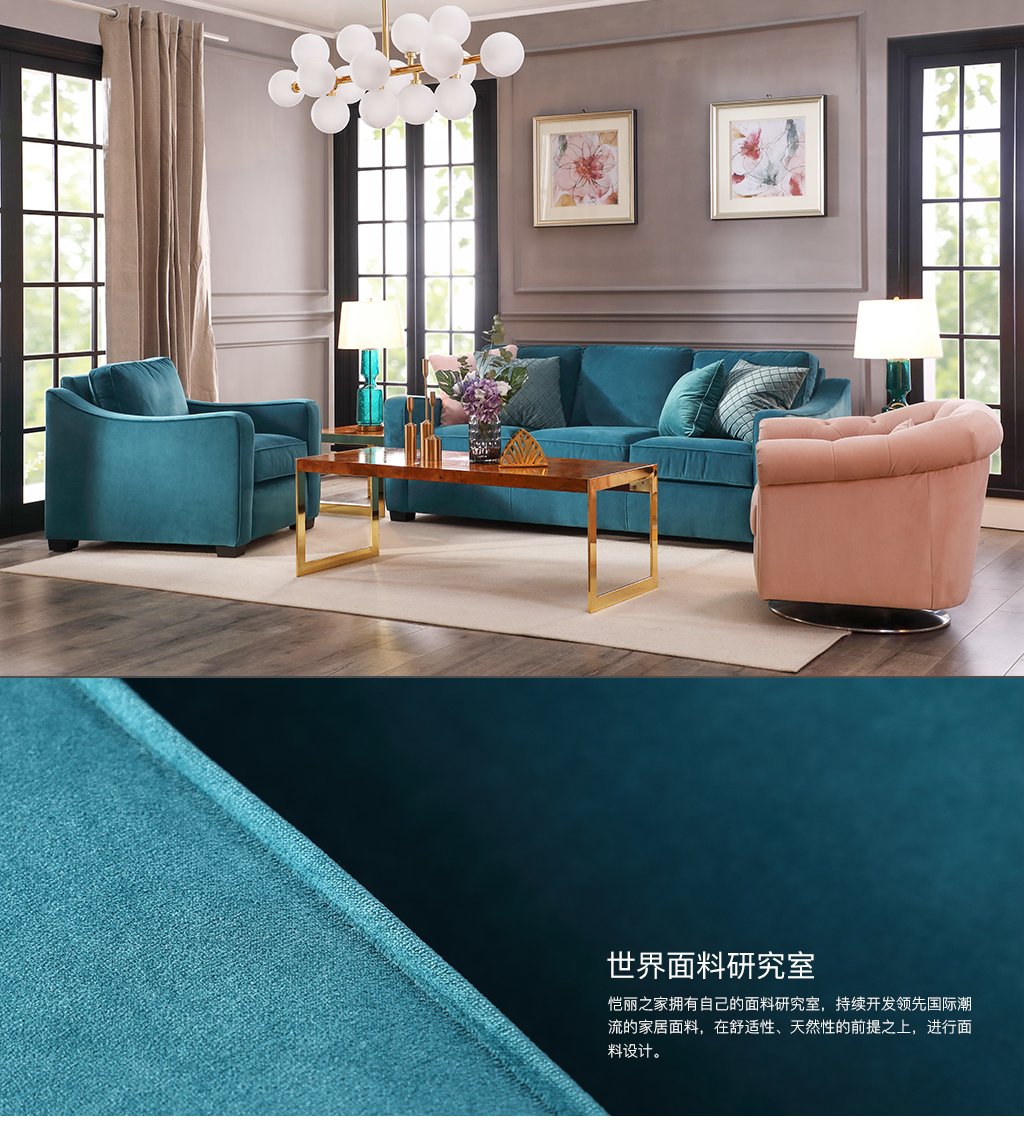 | 设计理念: | 沙发完美的扶手曲线造型设计,将美式经典的沙发款式轻松过渡到了美式现代风格,摒弃了传统美式沙发的沉闷、厚重;沙发蓝色格调,为大都市时尚人士精心打造。沙发采用高档绒布面料,绒面饱满,亲肤舒适,以及沙发高回弹坐垫、饱满的靠包,给予使用者身体各部位更高的支撑,带来美式家居生活的轻松舒适、休闲自在! |