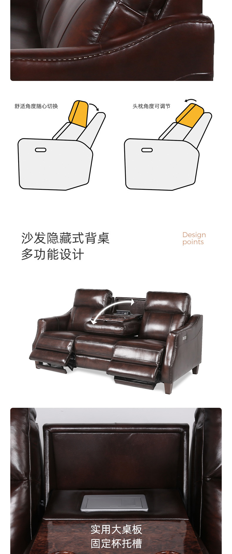 | 设计理念: | 美式经典电动功能沙发,沉稳大气深棕色,原汁原味美式风情,在功能沙发造型上,恺丽之家产品设计师,运用现代创新艺术设计手法,摒弃传统功能沙发的臃肿,线条更加精致简约,更加节省现代居住空间,人体工学分段式创新设计,实现全身心的伸展与放松,同时置入智能科技家居功能,一键触发,实现更多可能性。全新打造集美观设计与实用为一体现代功能沙发, 符合都市人不将就,不赘余的生活追求,打拼不再孤军奋战,放松休闲有伴。 |