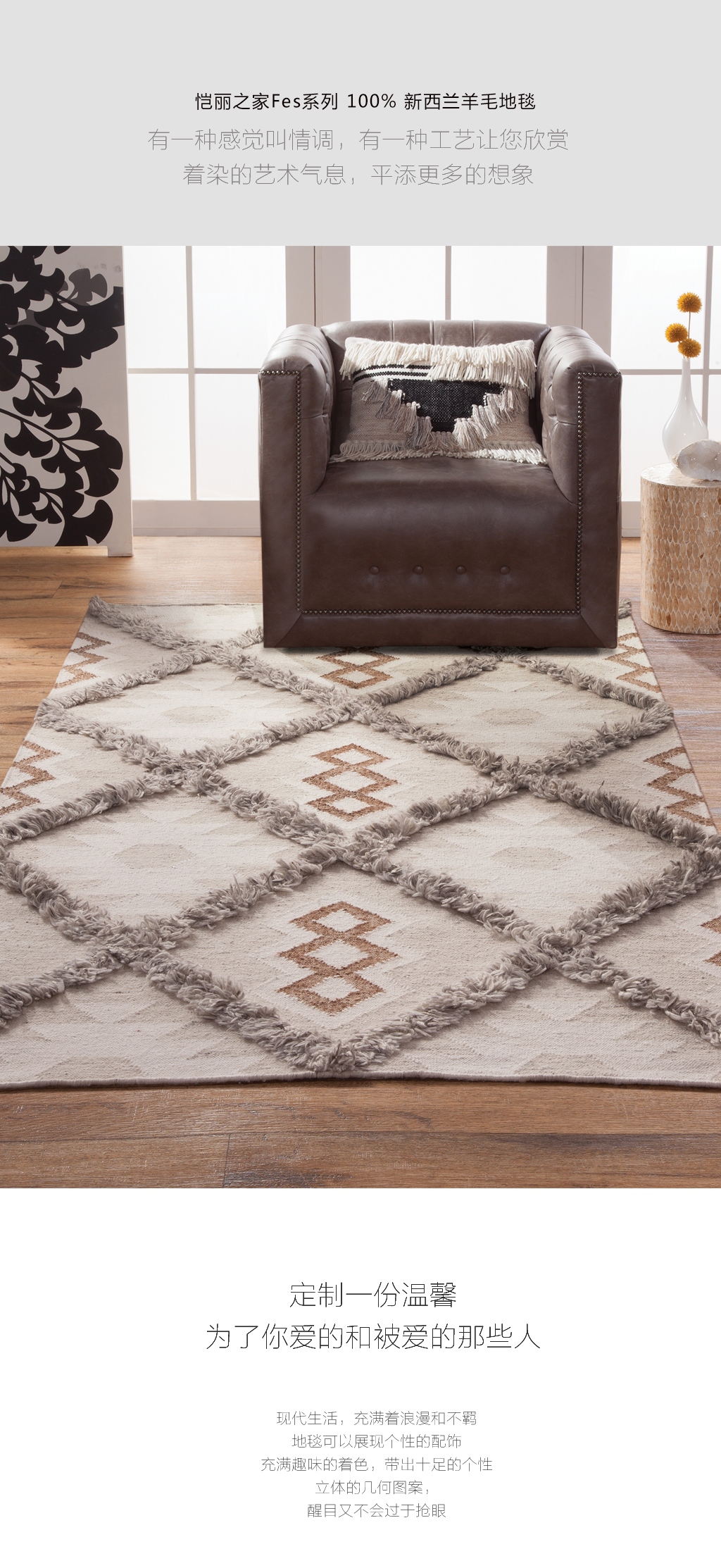 | 设计理念: | 恺丽之家Fes系列 100% 新西兰羊毛地毯,沉静柔和,别具一格的艺术特色,养一种心境,换一种新生,现代生活,充满着浪漫和不羁; 立体几何纹理图案,带出十足的个性, 生活由此而多姿多彩。羊毛地毯的手感柔和、弹性好、色泽鲜艳且质地厚实、抗静电性能好、不易老化褪色。 羊毛地毯有较好的吸音能力,可以降低各种噪音。 |