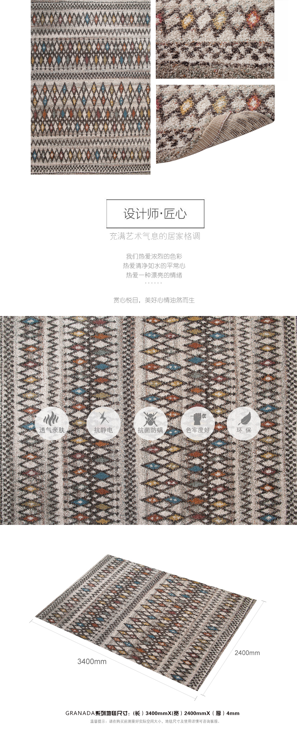 恺丽之家Granada系列,进口粘胶地毯,有一种感觉叫情调,有一种工艺让您欣赏;着染的艺术气息,平添更多的想象;地毯可以展现个性的配饰, 充满趣味的着色纹路,带出十足的个性 , 时尚的几何图案,醒目又不会过于抢眼。定制一份温馨,为了你爱的和被爱的那些人。