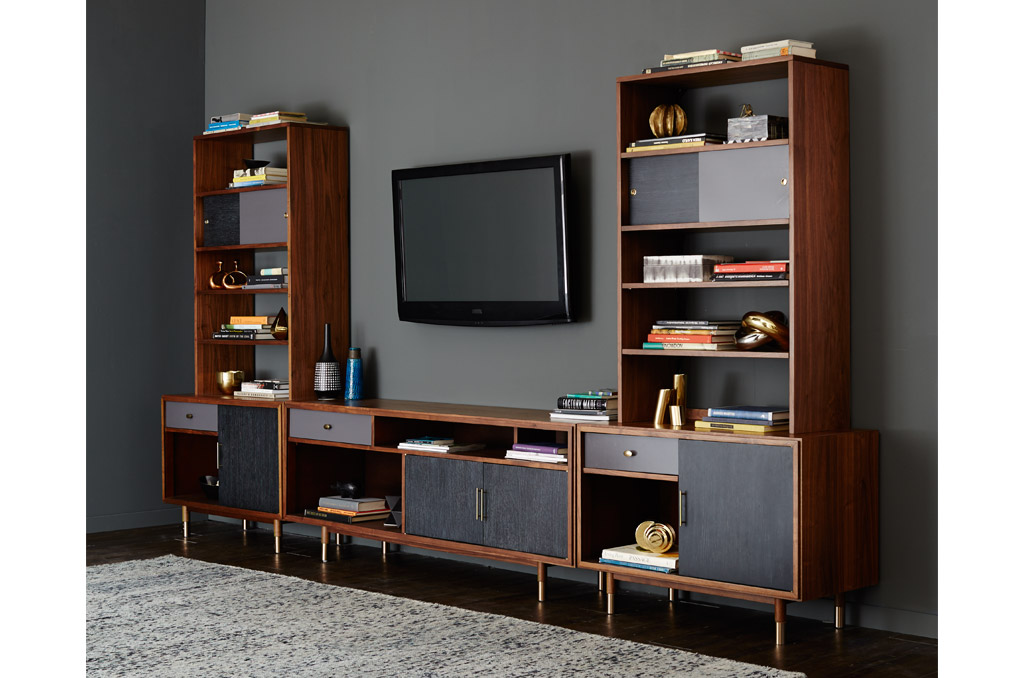 多功能电视机柜,书柜, 实用美观,可用于客厅,书房。 ,胡桃木色与经过拉丝处理的橡木门, 高级灰抽屉门,及铜脚,拉手,让颜色,材质在强烈的碰撞中构成了新的平衡。